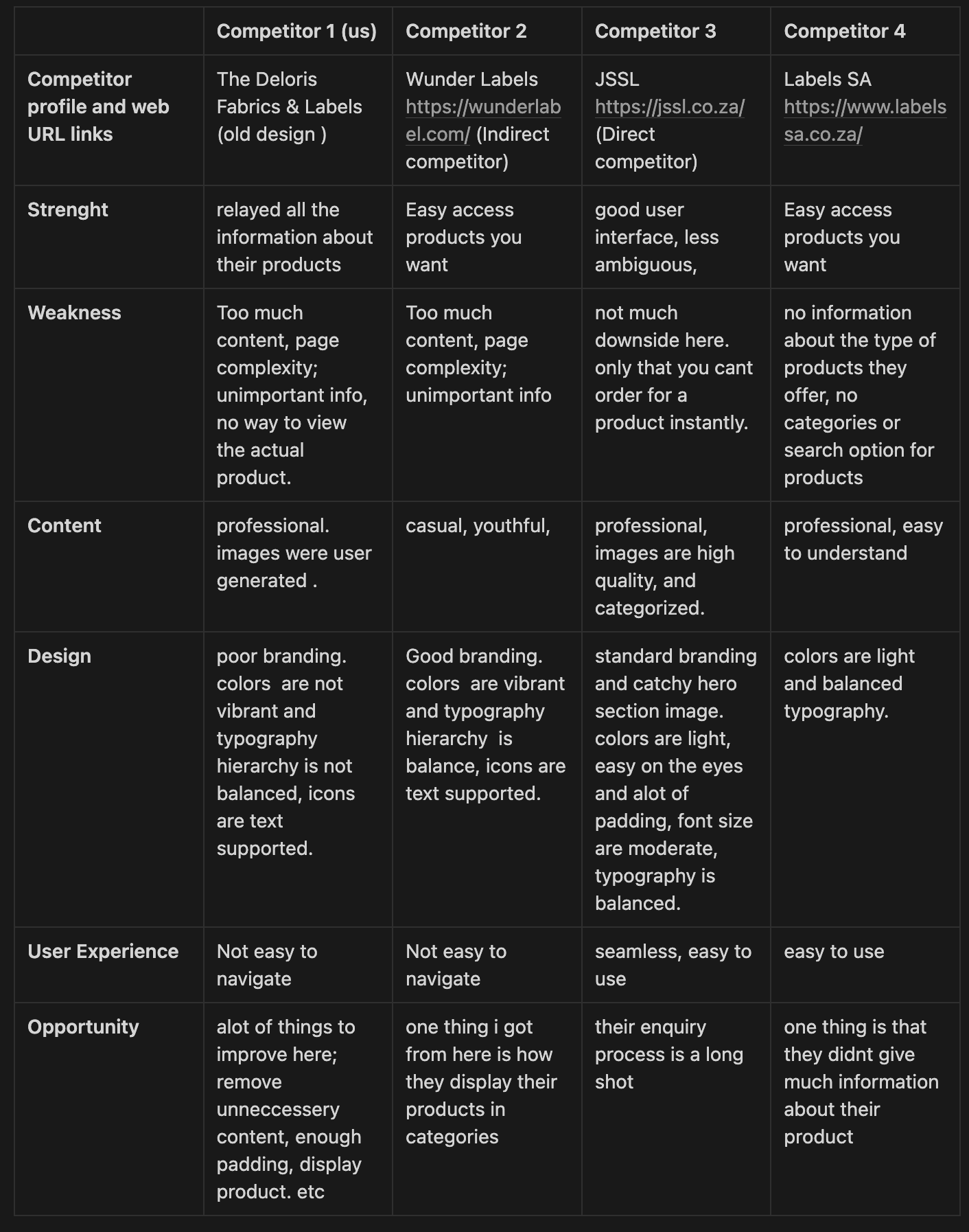 i performed competitive analysis to see what other existing companies both direct and indirect competitors provide and analyse their problems and success. I will be using a S.W.C.D.UX.O Analysis which is essentially a S.W.O.T analysis but more refined. It stands for: