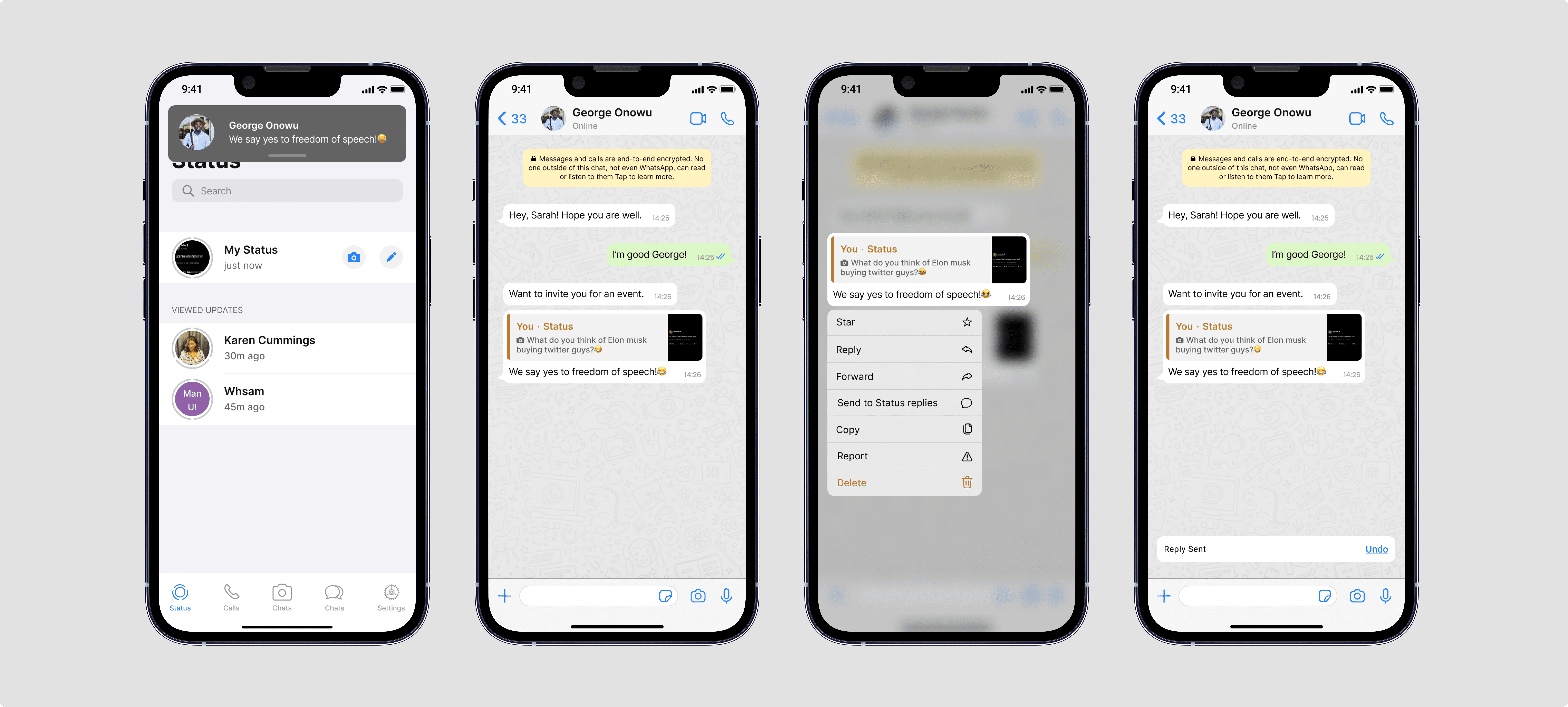 Creating a seamless experience for whatsApp users to easily show a particular status reply on their status reply section, where other contacts can view them. Also not exposing private info about my contacts like their names or pictures.