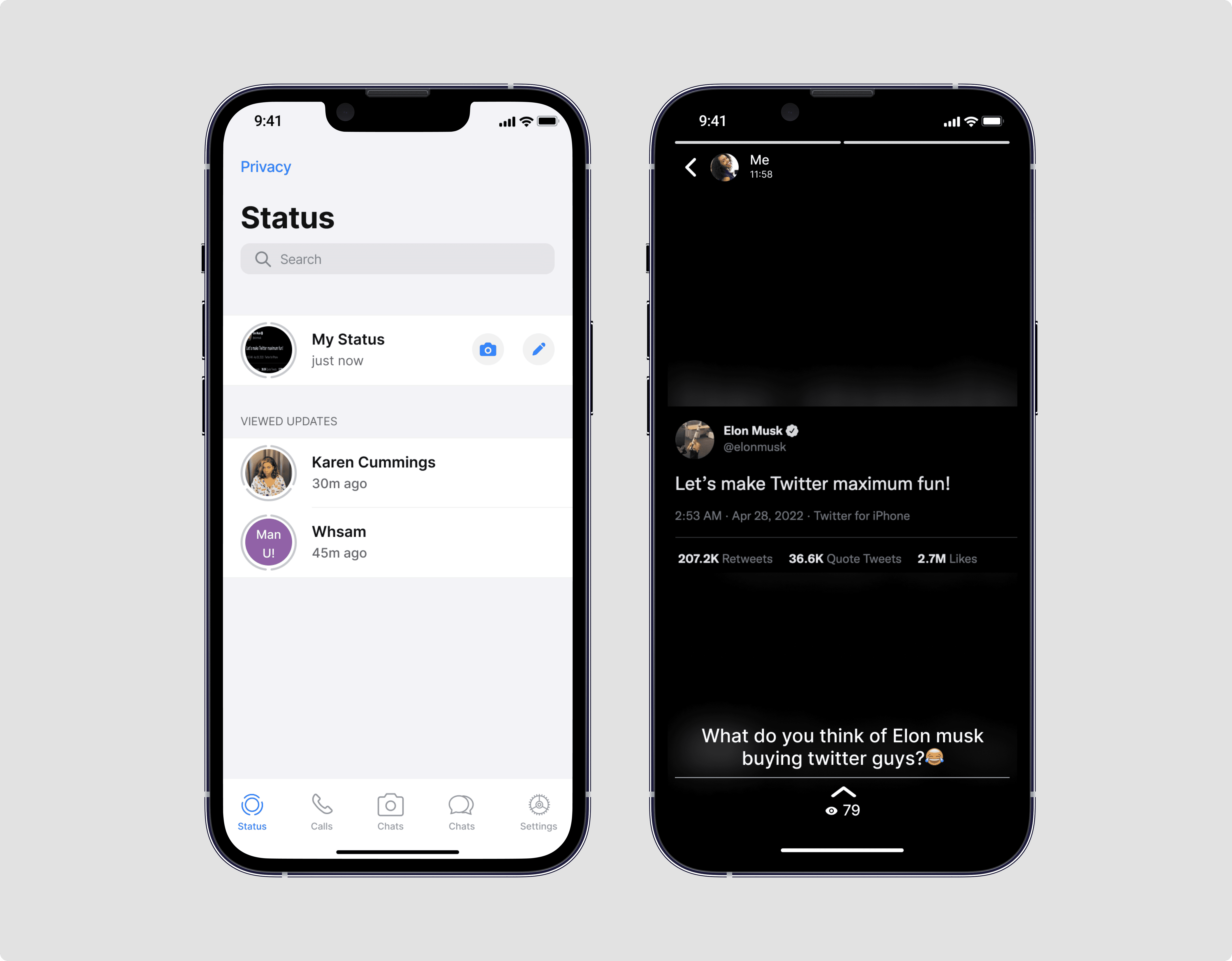 This screens are showing the view of when a user just uploads a status and hasn’t shared or sent any reply to the status. This is the main whatsApp UI