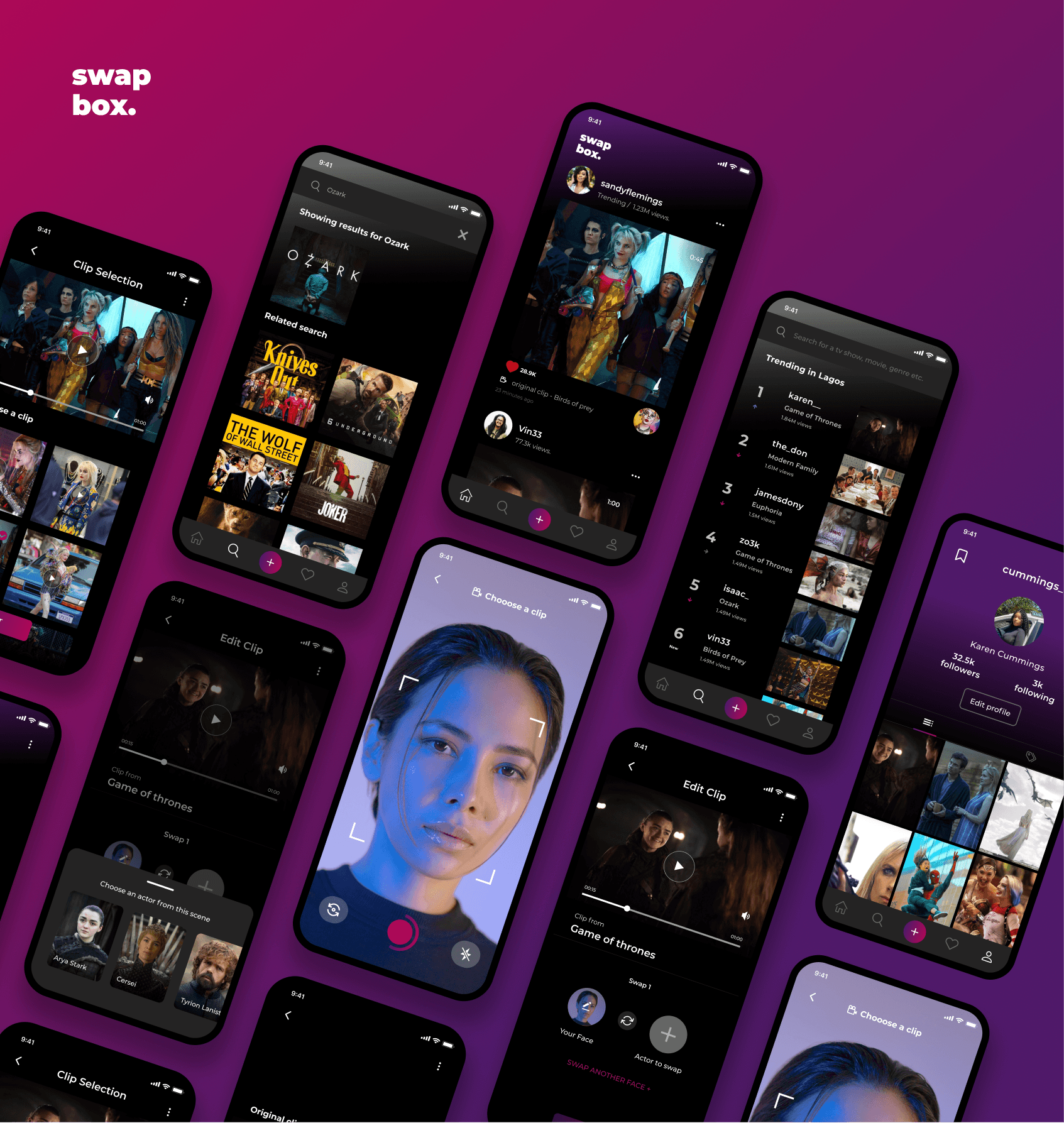 Swapbox is a movie app concept that you can search for movies you like and swap a character face to your face or of any image provided you upload the specific dimentions of the face.